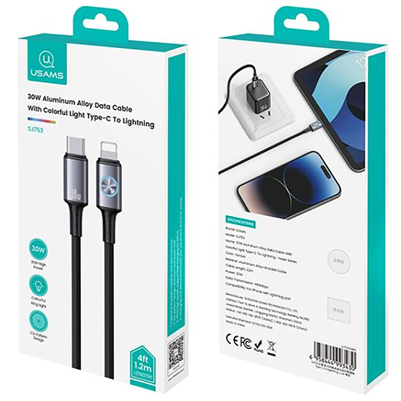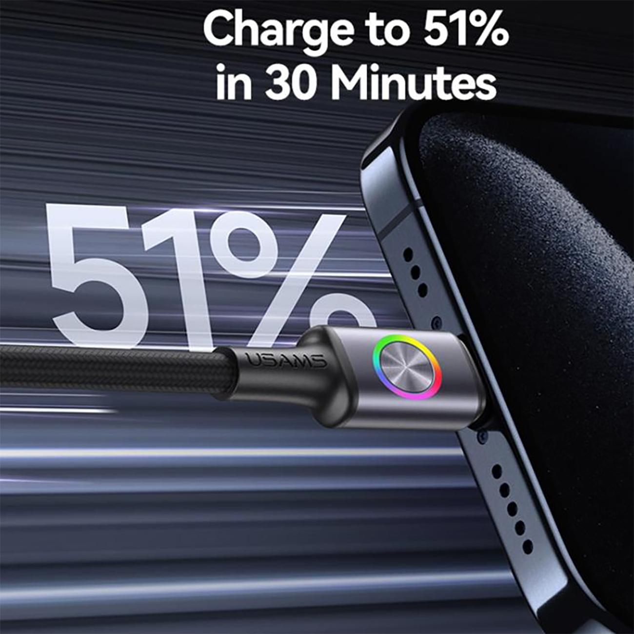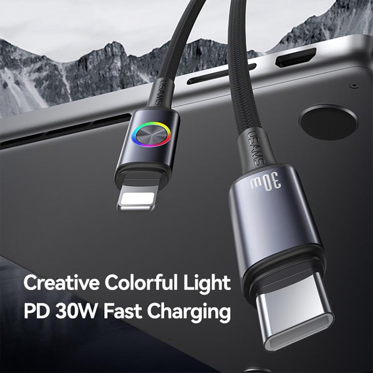 USAMS SJ753 30W Type-C to 8 Pin Aluminum Alloy Data Cable with Colorful Light 1.2m