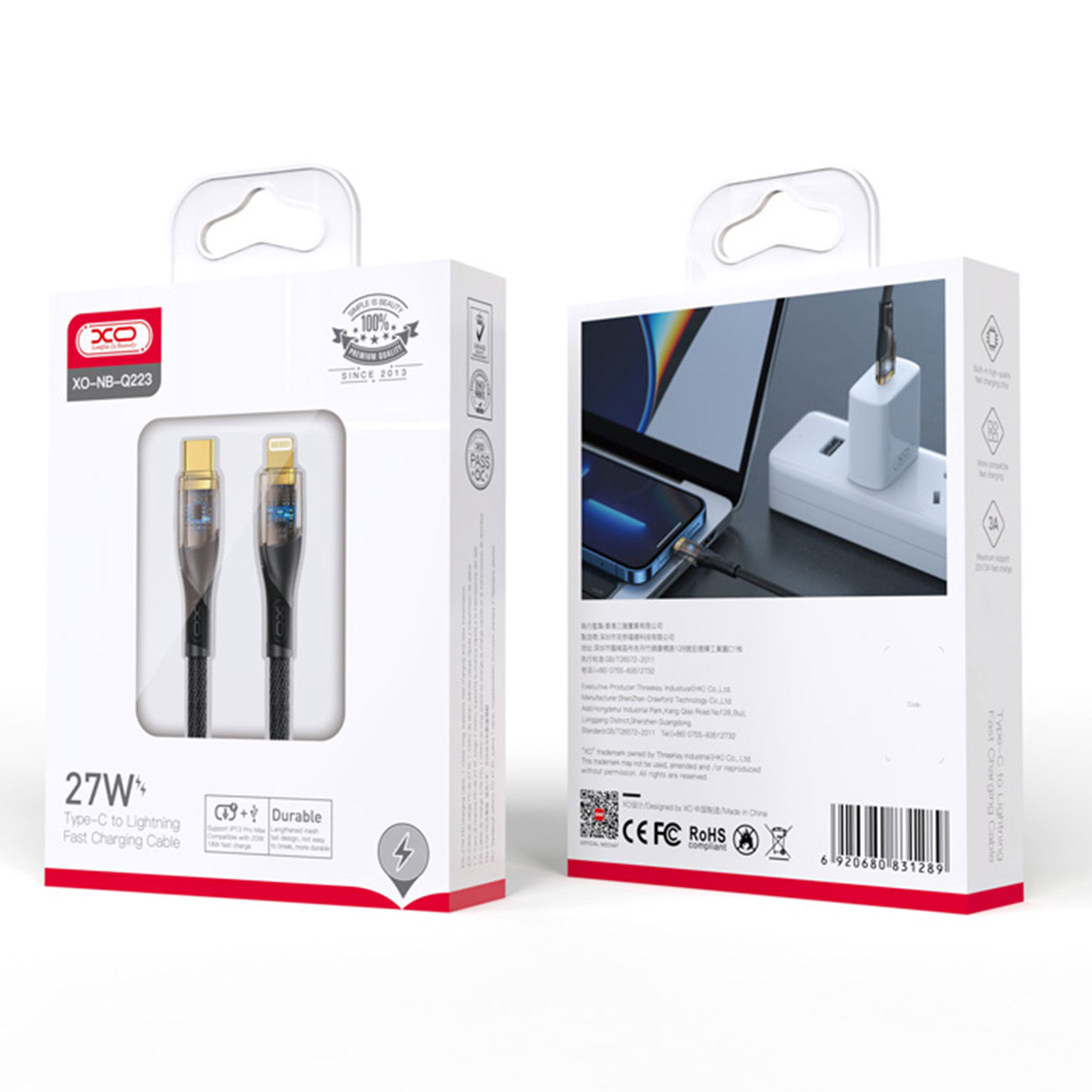 کابل شارژ سریع تایپ سی به لایتنینگ 27 وات یک متری طرح شفاف ایکس او NB-Q223A